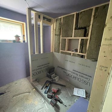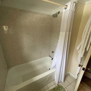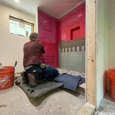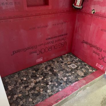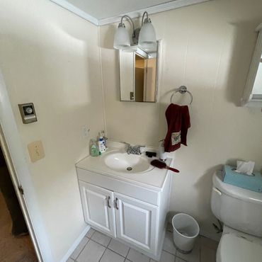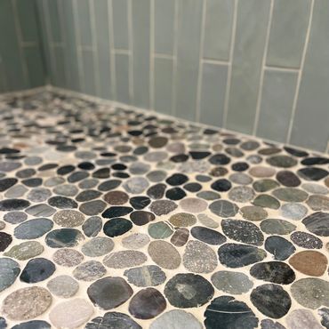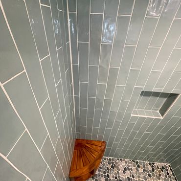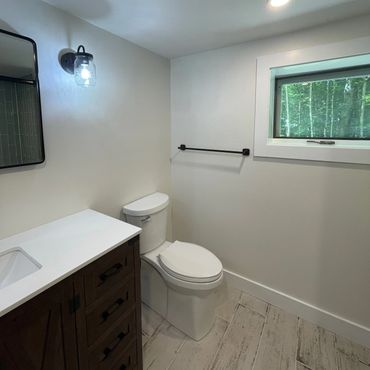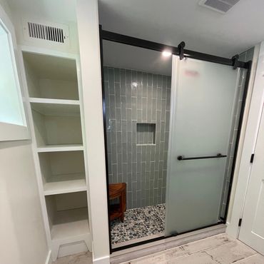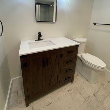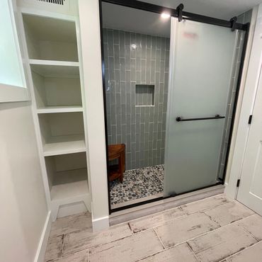 This basement bathroom got a complete farmhouse makeover! The homeowner wanted a fresh and spa-like feel, and we delivered. We demoed the old bathroom and started fresh. For the shower, we created a truly unique experience. The floor features river rock interlocking tile – it feels amazing underfoot and creates a calming, natural pebble look, like you're standing right in a riverbed. The shower walls surround you in calming subway tile, but with a modern twist – we installed them in a vertical staggered brick pattern. Outside the shower, we continued the farmhouse vibe with rustic wood-look tile flooring throughout the bathroom. The vanity is a classic farmhouse style, perfect for storage and function. To maximize space, we opted for a simple recessed medicine cabinet. But the details make the design! We found some amazing mason jar sconces that add a touch of vintage farmhouse charm and great lighting. For increased functionality, we built a linen closet to keep towels and toiletries tucked away. And the homeowner will love relaxing on the new bamboo shower bench after a long day. This remodel is a great example of how you can combine classic farmhouse elements with modern touches to create a unique and spa-inspired bathroom retreat.