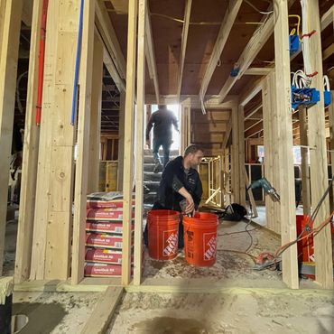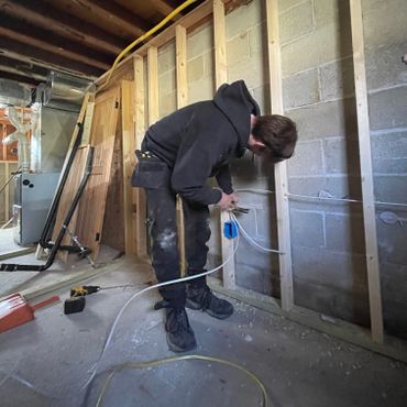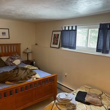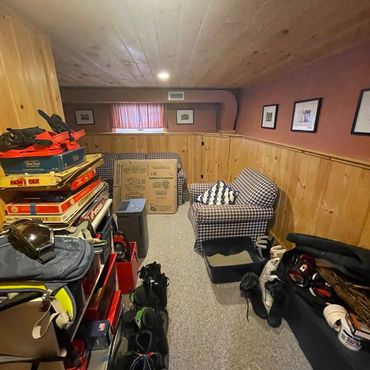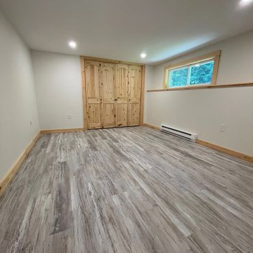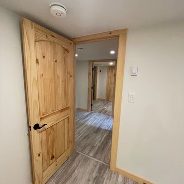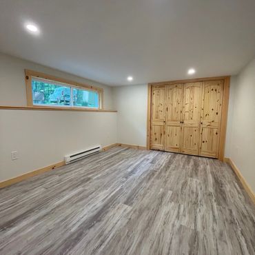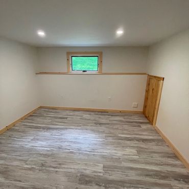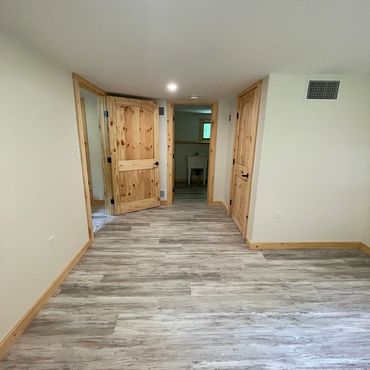 We completely transformed this dark, unfinished basement into a bright and livable space. This new layout provides additional living space for the homeowner, perfect for guests or a growing family. Using the same LVP flooring throughout the entire space creates a seamless flow and helps make the basement feel more open and expansive. The homeowner embraced a classic "cabin" aesthetic with beautiful knotty pine accents for the doors and trim. This adds warmth and character to the new living space.