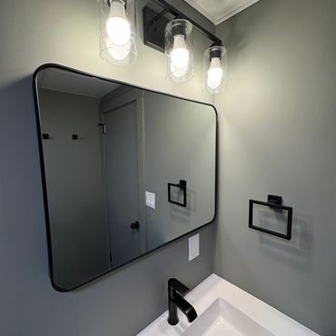 The first-floor bathroom was a prime candidate for a dramatic change. It went from a cramped, sad-looking space with a shower hidden behind a wall to a truly sleek, moody, and modern sanctuary. We picked a neo-angle glass shower featuring floor-to-ceiling 2x2 inch matte black tiles, complemented by a contemporary rain shower system. A sleek, black, hardware-free vanity completed this striking transformation, creating a sophisticated and spa-like atmosphere. Upstairs, the second-floor bathroom shed its dated light green acrylic bathtub insert. In its place, we installed a beautiful white soaking tub with a frameless sliding glass door, surrounded by bold, large-format quartzite stone-look tile. Our client loved the clean lines of the first-floor vanity so much that we decided to echo that design here, ensuring continuity and a refined look. Even the upper loft powder room received a complete overhaul. With new flooring, fresh wall paint, an updated vanity, toilet, mirror, lighting, and hardware, this compact space now feels entirely new and perfectly in sync with the home's refreshed aesthetic.