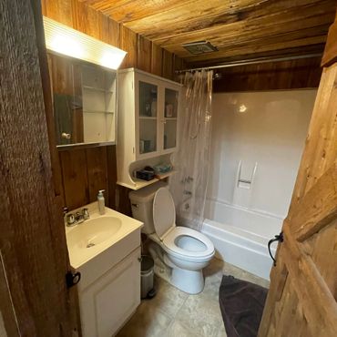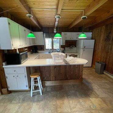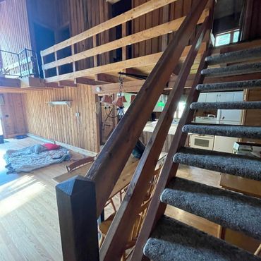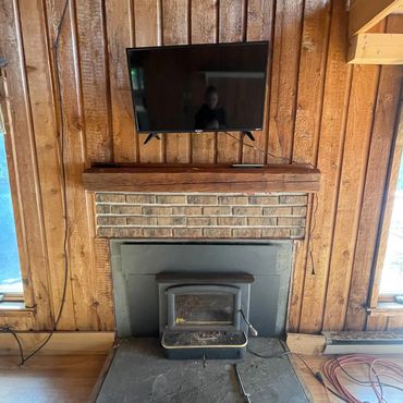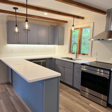 This was a complete home renovation where the client sought a modern yet rustic upgrade while preserving its charming simplicity. Our team and designer transformed this ski lodge from a dark, outdated space into a warm, inviting home with a contemporary rustic aesthetic. We installed new flooring throughout, gutted the bathrooms and kitchen, and replaced all downstairs walls with drywall and fresh paint to brighten the space. We also raised the loft to create a more usable living area below. The fireplace, once an eyesore, was given a stunning makeover with new stone and a mantle, becoming the focal point of the home. In the kitchen, we opted for blue cabinets, a white countertop, and sleek stainless steel appliances. All light fixtures were chosen for their modern farmhouse appeal, and we custom-built a mudroom with ample ski storage. Our designer collaborated closely with the homeowner to select furniture that complemented the new aesthetic. The transformation is truly remarkable!